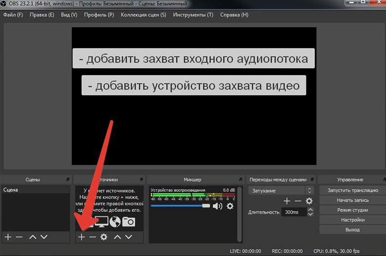 Внизу окна OBS в блоке «Источники» нажми «+» и добавь «Устройство захвата видео» (твоя камера или сплиттер). Затем добавь «Захват входного аудиопотока» и выбери микрофон. Без этих источников трансляция не будет работать.