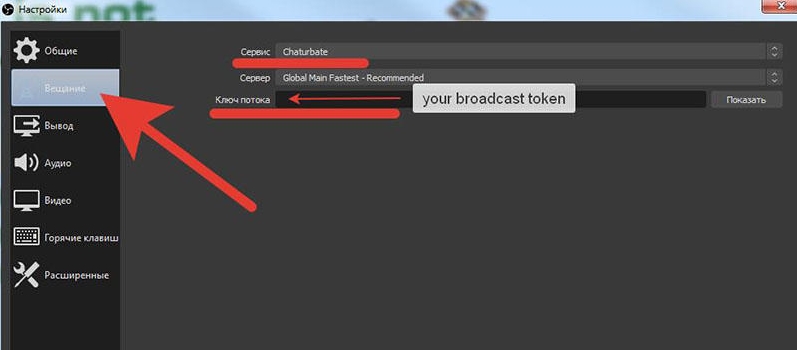 Перейди в «Вещание», выбери сервис Chaturbate и оставь рекомендованный сервер. Вставь в поле «Ключ потока» свой Broadcast Token (его можно найти на странице трансляции в разделе информации для OBS). Скопировал — вставил — готово.