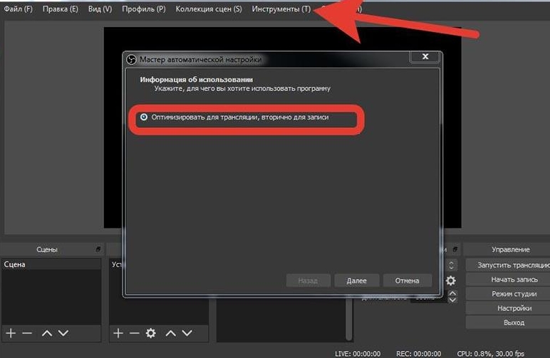 Если не хочется настраивать вручную, в «Инструменты» включи «Мастер автоматической настройки». Выбери «Оптимизировать для трансляции», укажи разрешение и 30 FPS, вставь ключ потока. После теста проверь предложенный битрейт и при необходимости снизь вручную.