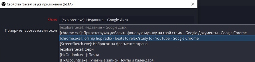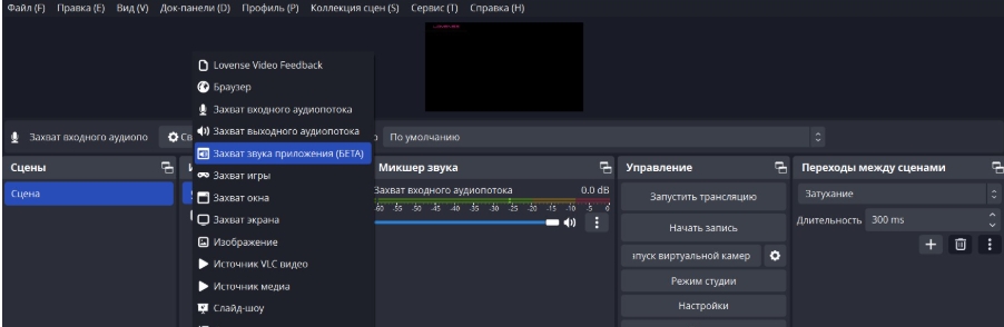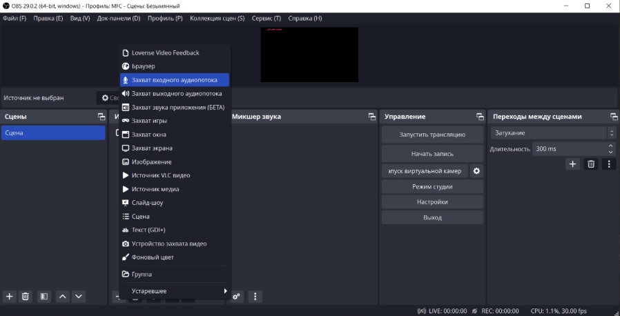 Добавь источник «Захват входного аудиопотока» и выбери микрофон. Музыка будет идти через динамики и захватываться микрофоном — способ простой, но звук может быть «грязным» из‑за окружающих шумов.