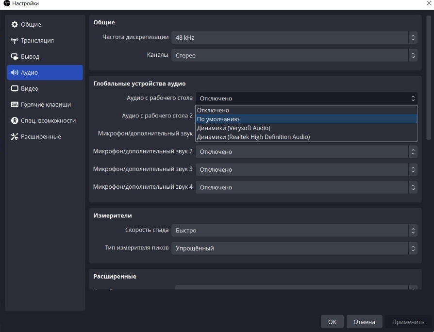 Открой «Настройки» → «Аудио», выставь частоту 48 Гц и включи «Аудио с рабочего стола». Если дорожка не видна — переключи между первым и вторым рабочим столом в настройках. При проблемах с отсутствием звука проверь драйверы (Realtek помогает во многих случаях).